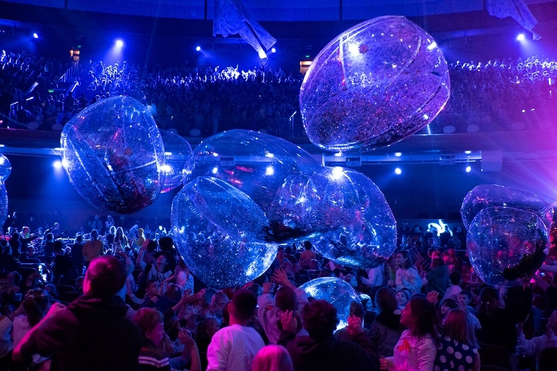 Пространство для фантазии: большая сцена и высота потолков позволяют использовать масштабные декорации, летающие конструкции и гигантские надувные игрушки — визитную карточку «Седьмой Радуги», выведенную в новом шоу на небывалый уровень.