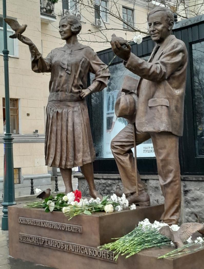 17 ноября возле театра им. Пушкина (некогда Камерного театра) состоялось открытие памятника режиссеру Александру Таирову и его музе и главной актрисе Алисе Коонен. Несмотря на то, что все время лил дождь, собралось множество людей: тут были актеры, представители прессы, исследователи творчества Таирова и Коонен и истории Камерного театра.