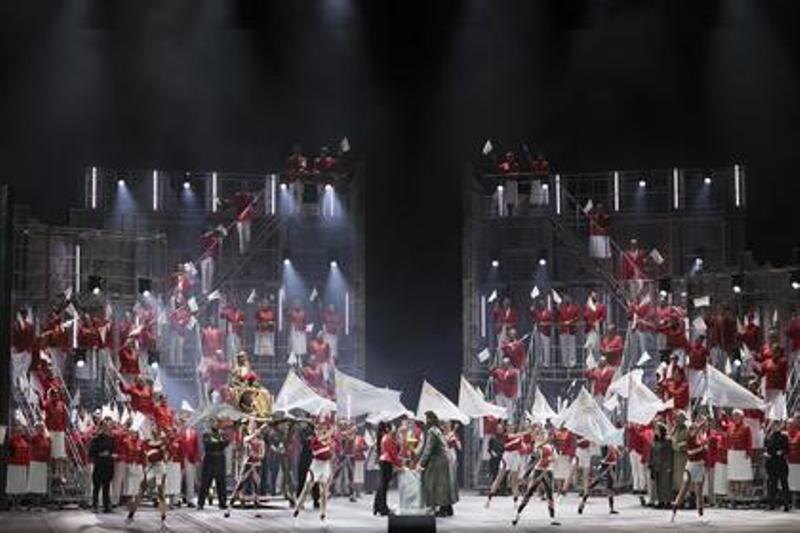 Величественные, масштабные и невероятно транс форменные декорации от художника Вячеслава Окунева – это одно из трех главных впечатлений-удивлений постановки «Турандот» в Большом. На Исторической сцене Большого декорации, которые раздвигаются и раскрываются, служат и задворками, и парадными залами дворца, и стадионом, на котором происходит «поединок» из загадок между Турандот и Калафом. Второй нюанс - аллегорический образ Принцессы: «небесное светило» в роли реальной Турандот, которая выходит на сцену в окружении детей (по сюжету она жестокая) – мило, чинно, благородно. Третья «новизна» - физкультурные парады, в коих принимает участие около сотни артистов в красно-белых одеждах.