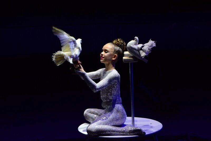 Эквилибр с голубями "Лети" под пронзительную музыку "Памяти Карузо" юной Камилы Степановой из Краснодара. Камила занесена в книгу рекордов России, с наибольшей продолжительностью виса на шее в воздушном кольце.